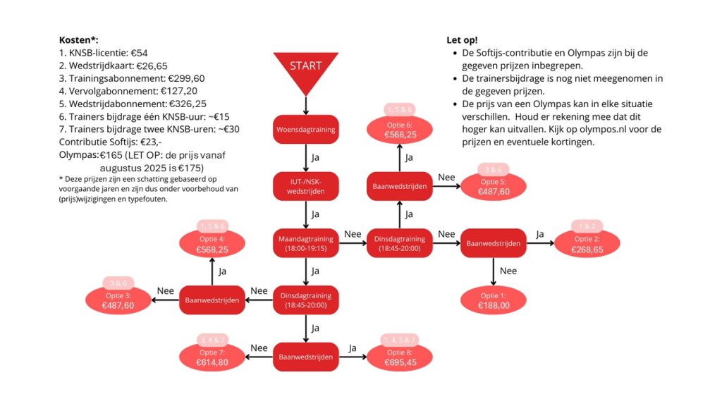Qua abonnement zijn er meerdere opties mogelijk. De flowchart hieronswe kan helpen bij het maken van een keuze en geeft weer wat de kosten zullen zijn en hoe deze zijn opgebouwd inclusief studenten Olympas en Softijscontributie en exclusief trainersvergoeding.